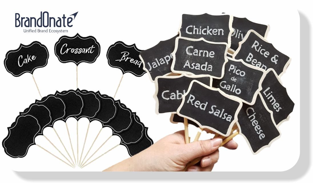 Custom food tags and tabletop labels.